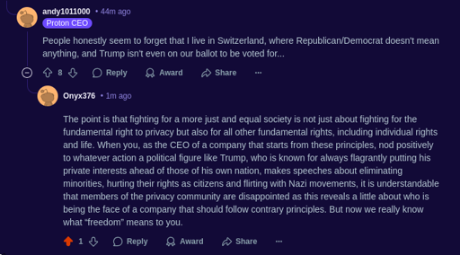 “The point is that fighting for a more just and equal society is not just about fighting for the fundamental right to privacy but also for all other fundamental rights, including individual rights and life. When you, as the CEO of a company that starts from these principles, nod positively to whatever action a political figure like Trump, who is known for always flagrantly putting his private interests ahead of those of his own nation, makes speeches about eliminating minorities, hurting their rights as citizens and flirting with Nazi movements, it is understandable that members of the privacy community are disappointed as this reveals a little about who is being the face of a company that should follow contrary principles. But now we really know what “freedom” means to you.”