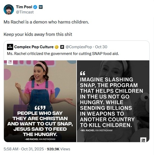 Tim Pool doesn’t understand that you’re supposed to wait for your enemy to say something inflammatory before you accuse them of being a demon. When someone’s comment is instead “we should feed kids, actually” and then you accuse them of harming children, you’re the one coming out of it looking like an asshole.