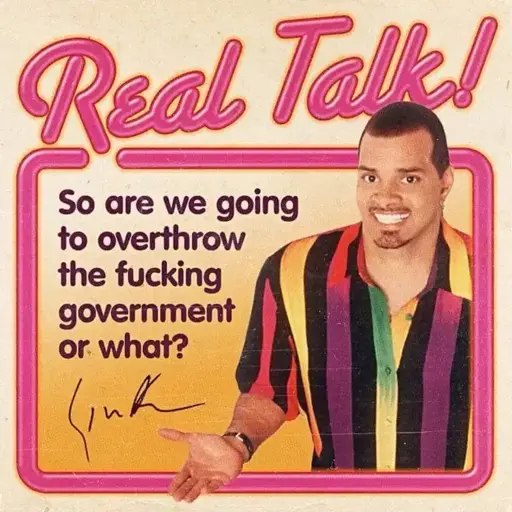 ID: photo of actor Sinbad in a neon pink frame, he has a wide slightly awkward smile, and has his hand out to gesture asking a question, above in pink neon letters it says: “Real talk!” and in the frame next to the photo it says in plain black text: “so are we going to overthrow the fucking government or what?”, with his signature bellow