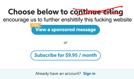 Formerly pretty good free resource for academic citations now turned into a giant pile of steamy hot garbage by the incredible asswipes at Chegg, a corporate name that mostly calls forth the image of a debilitating sexually transmitted infection.