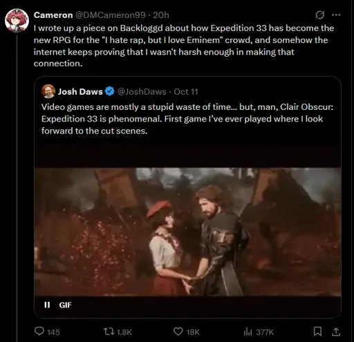Yuritopiaposadism [none/use name]@hexbear.net to Games@hexbear.netEnglish · 4 days agoIt is tiring see people disrespect the JRPG genre just because they hate anime and act like a turn based game cant be mature. Nobody who says shit like this should be taken seriously.hexbear.netimagemessage-square42linkfedilinkarrow-up181arrow-down10