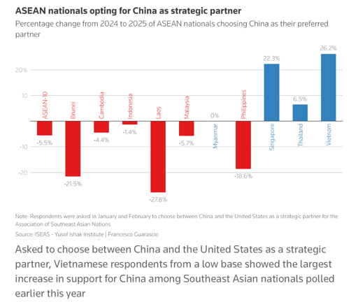 Asked to choose between China and the United States as a strategic partner, Vietnamese respondents from a low base showed the largest increase in support for China among Southeast Asian nationals polled earlier this year.