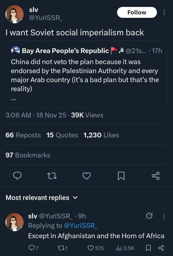 U could use basically the same argument to support US imperialism in Afghanistan. “Fighting against misogynistic terrorists is bad, dont ya know?” Soviet intervention in Afghanistan wasnt bad cuz they were fighting the mujahideen, it was bad cuz they imposed a brutal occupation to prop up an already unpopular government, which never beat the mujahideen either and very likely made more ppl support them, just like the US occupation made more ppl support the taliban. This is all Americas fault for arming the mujahideen (baiting the soviets into war was their plan from the start, after all), yes, but the USSR wasnt good in this war either (idk if id actually call it “social-imperialism”, but it wasnt good either way)